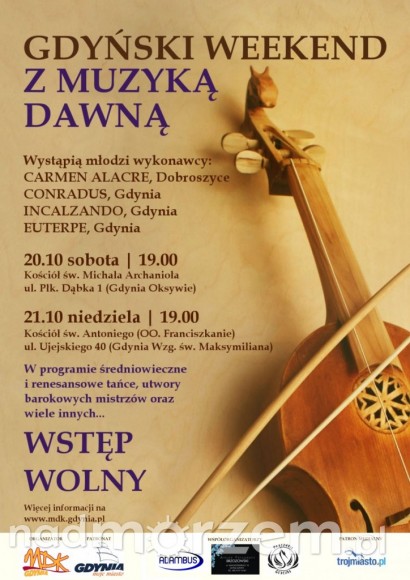 Zespół Muzyki Średniowiecznej "Euterpe" działający przy Młodzieżowym Domu Kultury w Gdyni i organizuje Gdyński Weekend z Muzyką Dawną w dniach 20-21.10.2012r. W ramach Weekendu odbędą się dwa koncerty - jeden w Kościele św. Michała Archanioła (20.10 o godz. 19:00) w Gdyni Oksywiu, a drugi w Kościele św. Antoniego (Ojcowie Franciszkanie) (21.10 o godz. 19:00) na Wzgórzu św. Maksymiliana.