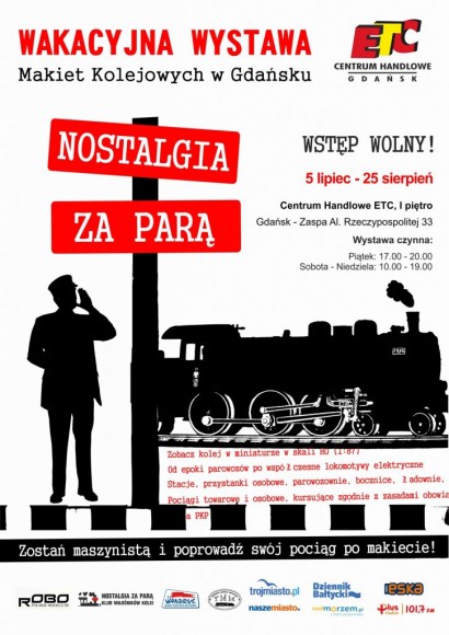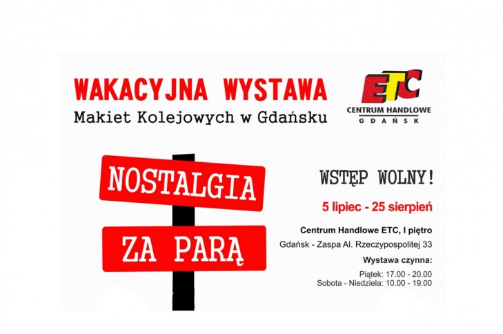 Klub Miłośników Kolei "Nostalgia Za Parą" (www.nostalgiazapara.pl) serdecznie zaprasza do uczestnictwa w Wakacyjnej Wystawie Makiet i Modeli Kolejowych Nostalgia Za Parą, którą organizujemy w Gdańsku w Galerii ETC (Al. Rzeczypospolitej 33), w lipcu i w sierpniu. Makiety będzie można oglądać w piątki od 17 do 20, a w soboty i niedziele w godzinach 10-14 i 16-19. Wstęp na Wystawę jest bezpłatny.