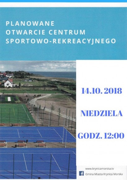 Burmistrz Miasta Krynica Morska oraz Przewodnicząca Rady Miasta w Krynicy Morskiej serdecznie zapraszają wszystkich mieszkańców oraz turystów na otwarcie Centrum Sportowo-Rekreacyjnego.